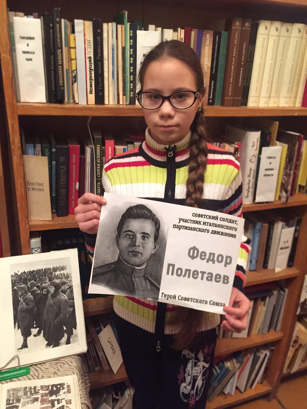 Читатели Пеньковской библиотеки присутствовали на военно-патриотическом уроке «Герой двух стран», посвящённому Федору Полетаеву. Ребята узнали о боевом пути героя, его бегствах из фашистского плена, действиях в итальянском движении сопротивления под именем Федора Поэтана и о героической смерти нашего земляка.