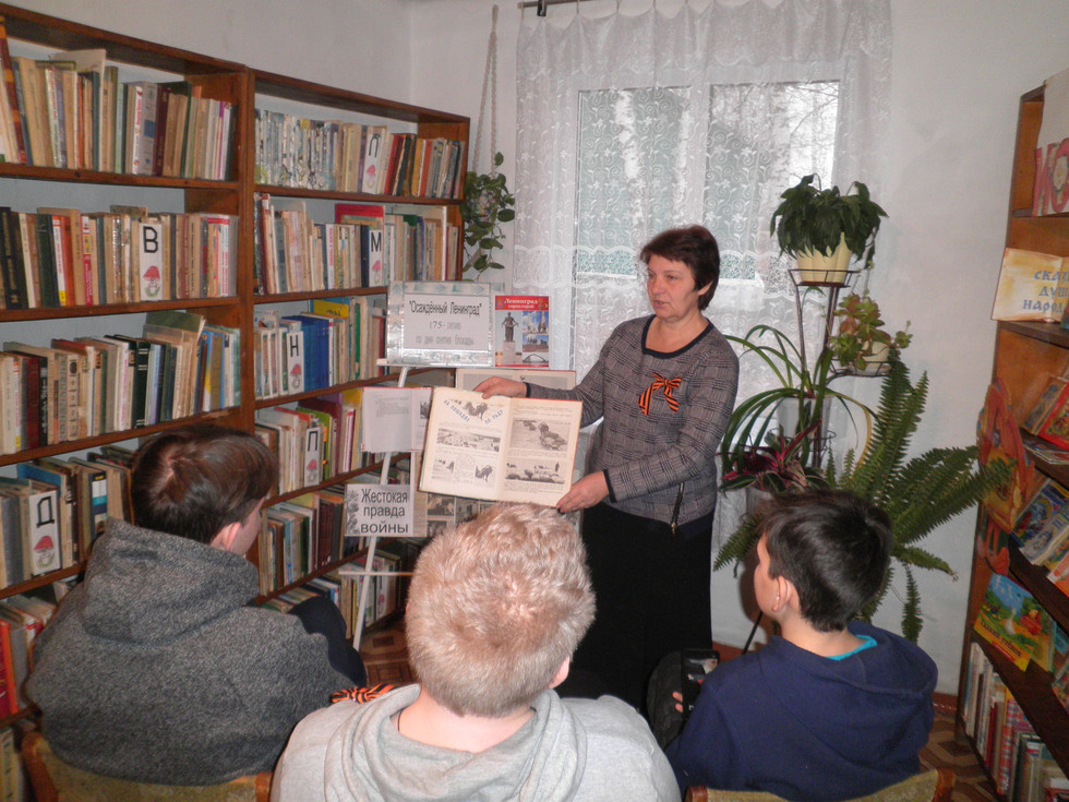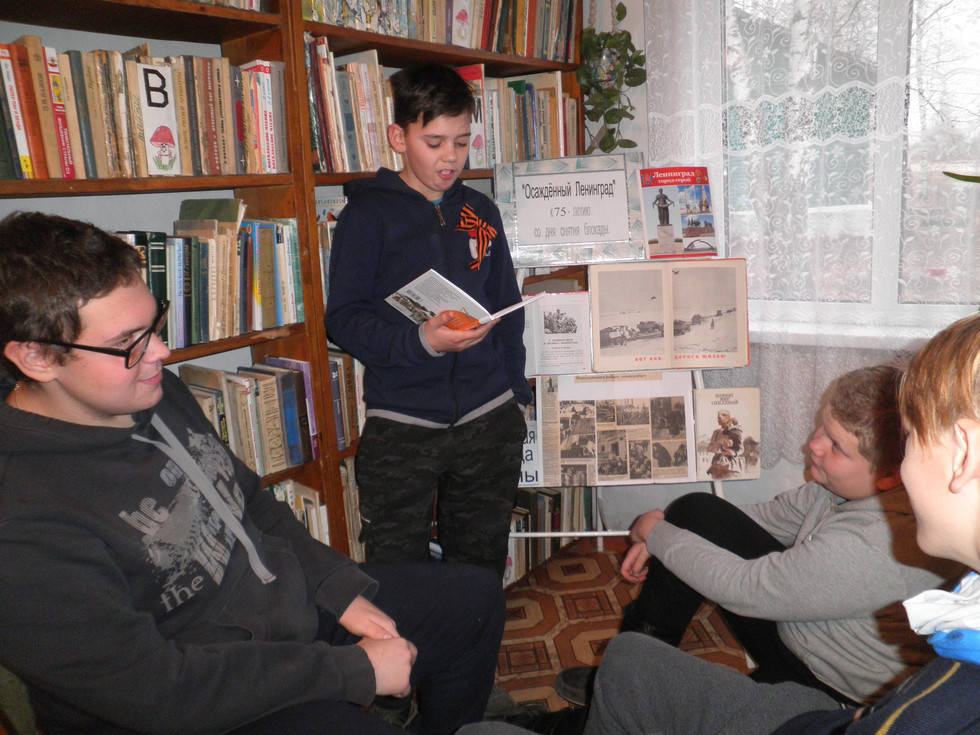 Библиотекарь Жулина Галина Азизовна рассказала о том страшном времени, о том, через какие испытания пришлось пройти жителям осажденного Ленинграда, о спасительной «дороге жизни» через Ладожское озеро. Особенный отклик у присутствующих вызвали строки из дневников блокадных детей — зачитывались из дневника Тани Савичевой. Оживленно прошло чтение-обсуждение рассказа о ленинградцах и подвиге Ленинграда «Первая колонна» .